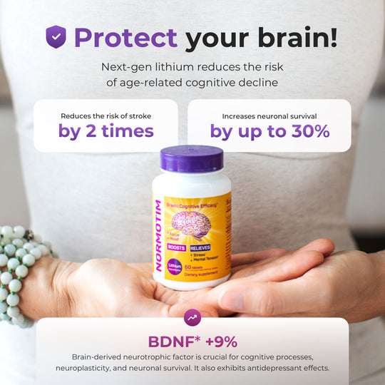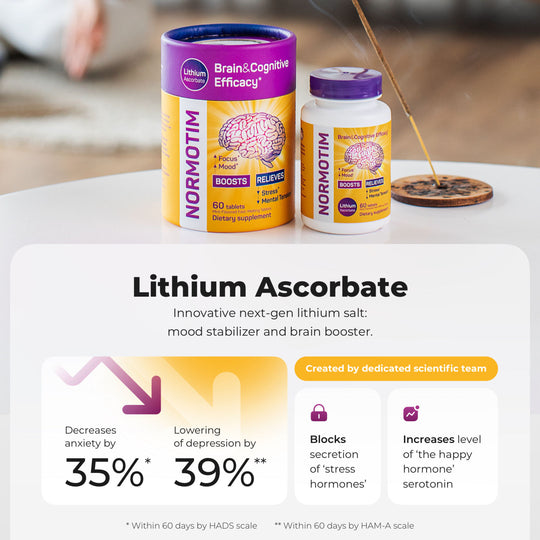 Lithium acts as a mood stabilizer, reducing anxiety and symptoms of depression [2]. It also prevents the development of acute stress by blocking adrenaline and noradrenaline. Additionally, it has a brain-boosting effect, enhancing concentration and improving memory.